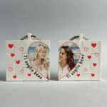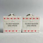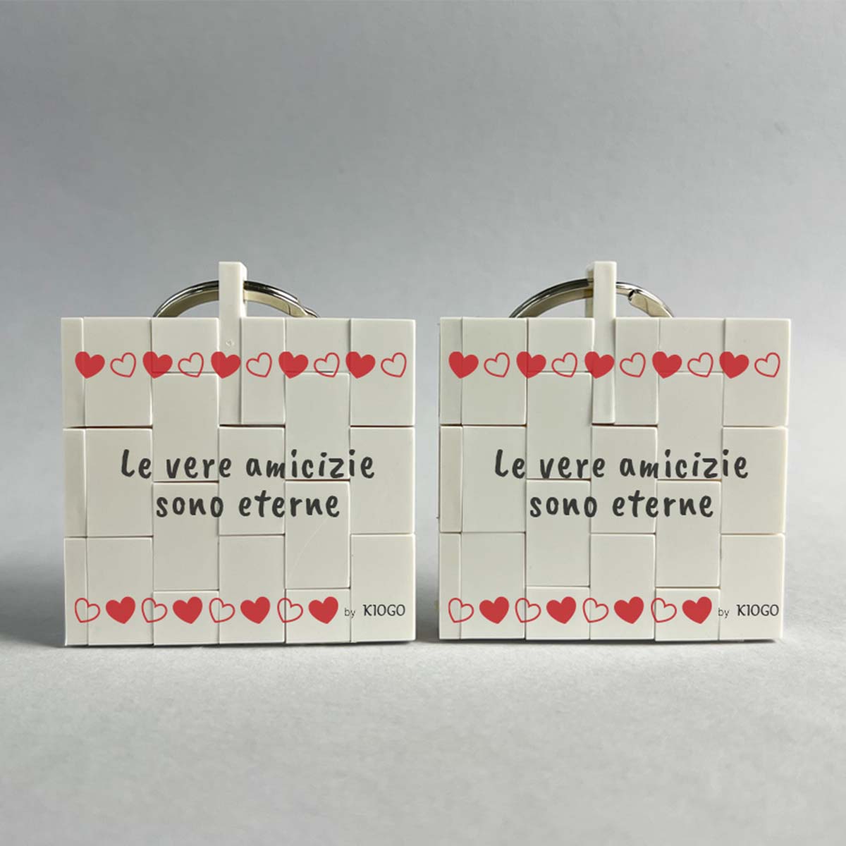 Lavorazione: Stampa fronte con cuore diviso tra i 2 portachiavi con immagine di amiche circondate da cuoricini e scritta “Ti voglio bene”. Stampa retro con cuoricini in alto e in basso e frase: ”Le vere amicizie sono eterne”.