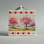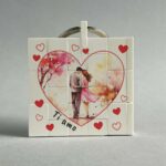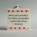Lavorazione: Stampa fronte a cuore con innamorati circondati da cuoricini e scritta “Ti amo”. Stampa retro con cuoricini in alto e in basso e frase ”Amare non è guardarsi l’un l’altro, ma guardare insieme nella stessa direzione ”.
