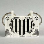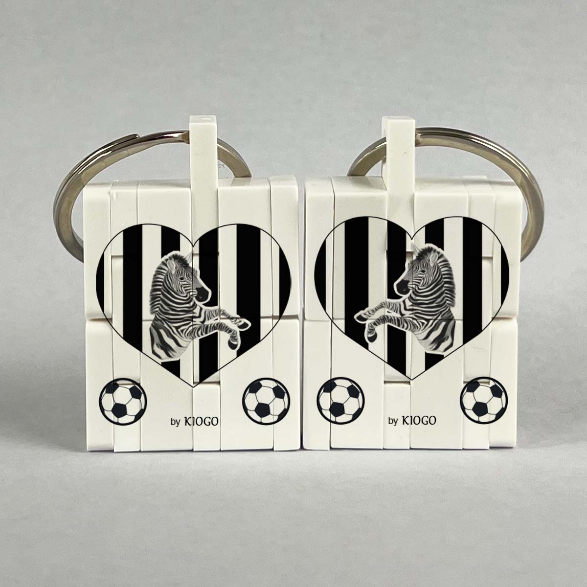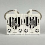 Lavorazione: Stampa fronte con cuore bianconero diviso tra i 2 portachiavi con in basso zebra rampante, in alto pallone bianconero e scritta “cuori bianconeri”. Stampa retro con cuore bianconero con al centro zebra rampante e 2 palloni bianconeri in basso.