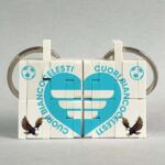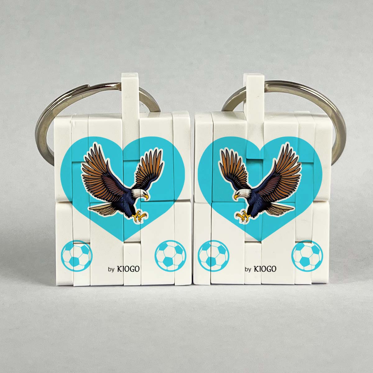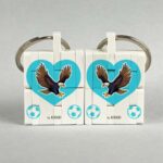 Lavorazione: Stampa fronte con cuore celeste e strisce bianche ad ala diviso tra i 2 portachiavi con in basso aquila in picchiata, in alto pallone biancoceleste e scritta “cuori biancocelesti”. Stampa retro con cuore celeste con al centro aquila in picchiata e 2 palloni biancocelesti in basso.