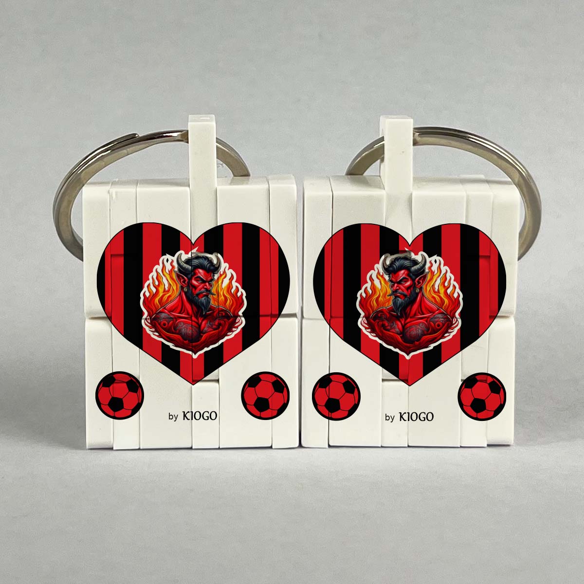 Lavorazione: Stampa fronte con cuore rossonero diviso tra i 2 portachiavi con in basso diavolo tra le fiamme in alto pallone rossonero e scritta “cuori rossoneri”. Stampa retro cuore rossonero con al centro diavolo tra le fiamme e 2 palloni rossoneri in basso.