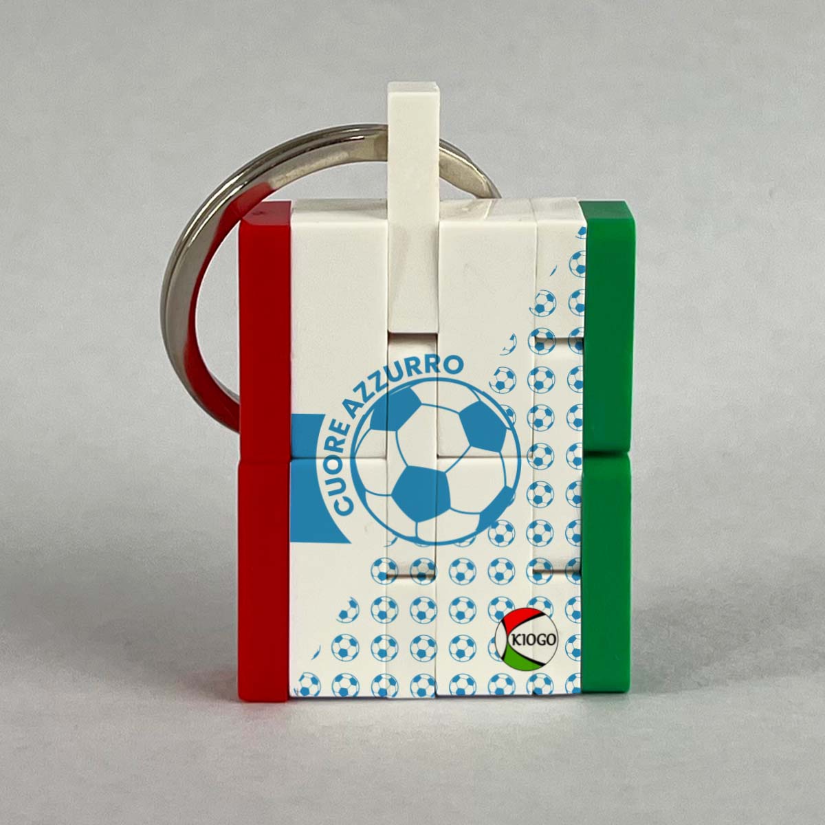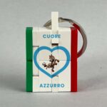 Lavorazione: Su mattoncini tricolore stampa fronte con cuore ad anello azzurro con al centro ciuccio che palleggia e scritta “cuore azzurro”. Stampa retro con palloni bianchi e azzurri e scritta “cuore azzurro”.