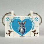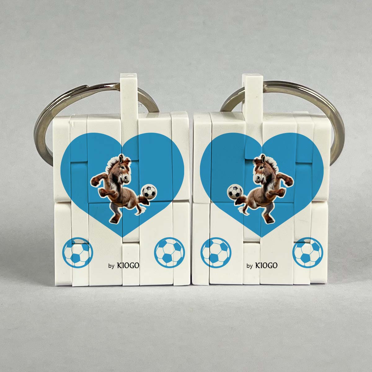 Lavorazione: Stampa fronte con cuore azzurro con al centro ciuccio con espressione fiera diviso tra i 2 portachiavi con in basso ciuccio che palleggia, in alto pallone azzurro e bianco e scritta “cuori azzurri”. Stampa retro cuore azzurro con al centro ciuccio che palleggia e 2 palloni azzurri e bianchi in basso.
