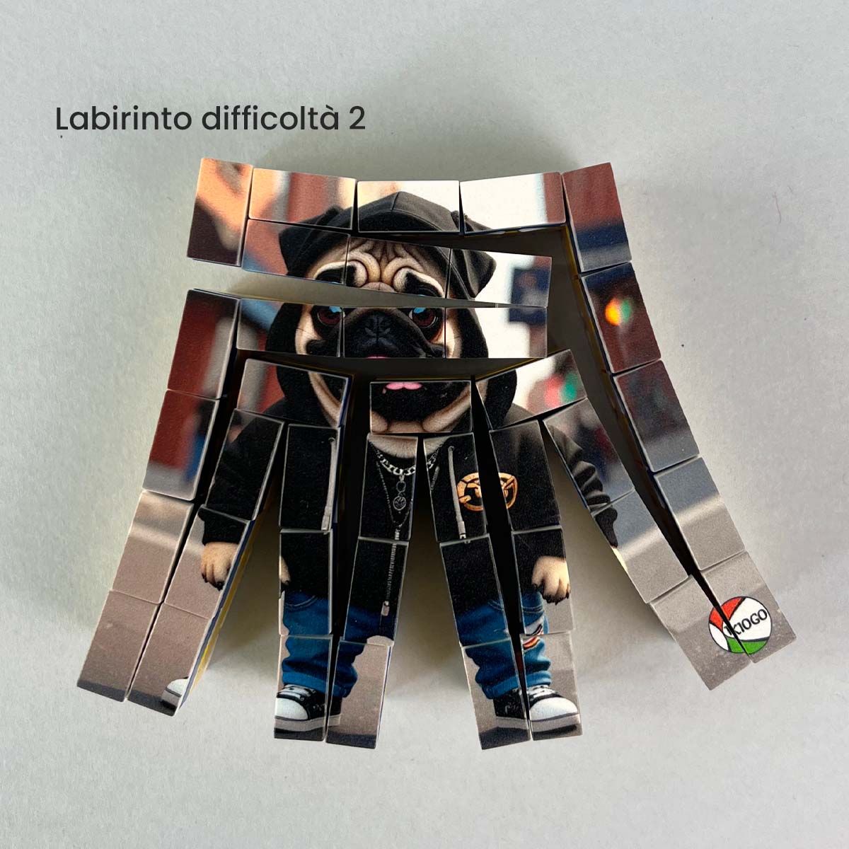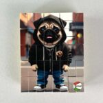 Quantità blocchetti: 280 Misure: L 112 x h 64 x P 26 Lavorazione: Immagine di un cane vestito in stile rock. Lo sfondo è una strada cittadina sfocata, con luci ed edifici ai lati.