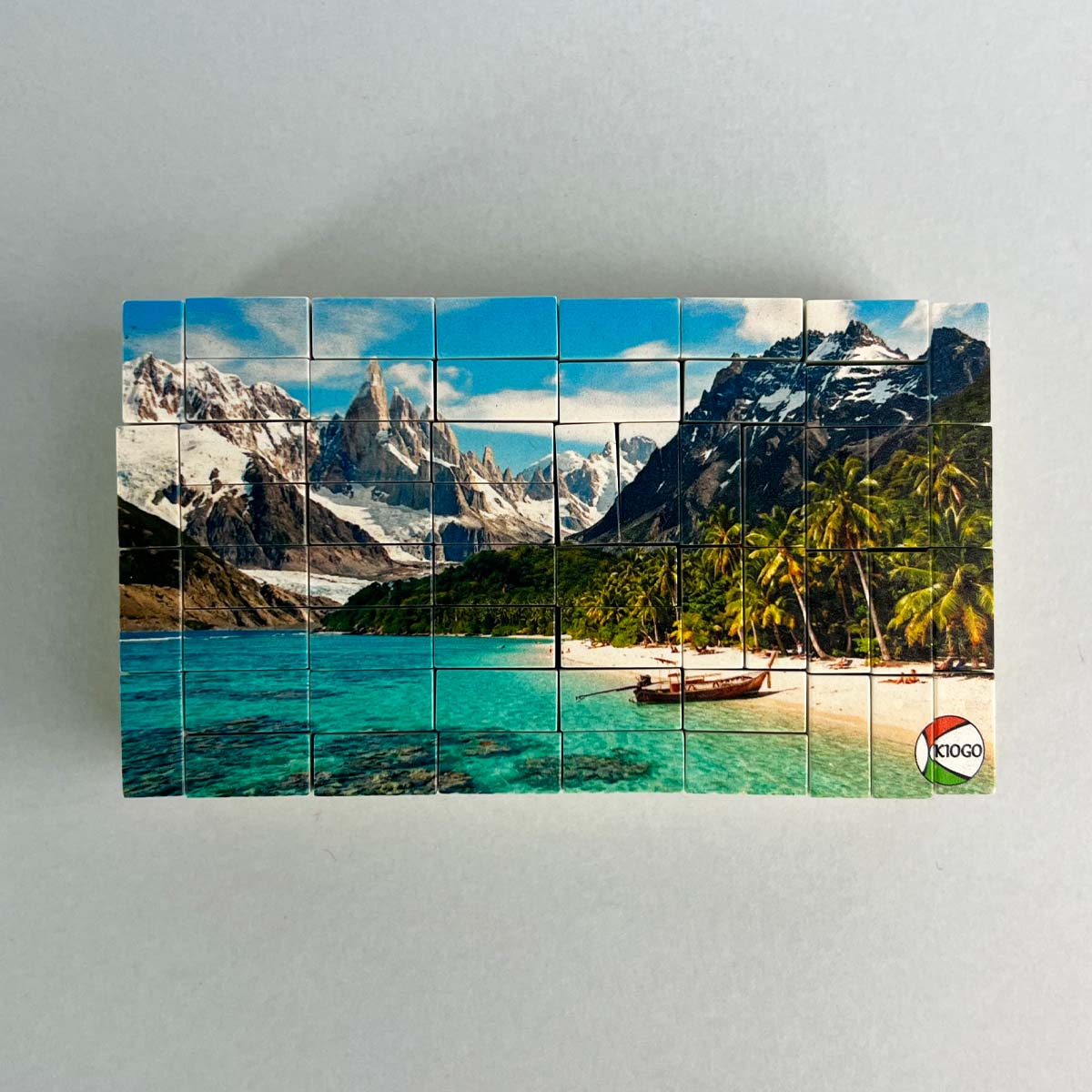 Quantità blocchetti: 280 Misure: L 112 x h 64 x P 26 Lavorazione: Immagine di un isola tropicale con mare, spiaggia, palme e montagne innevate sullo sfondo.