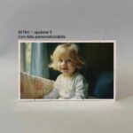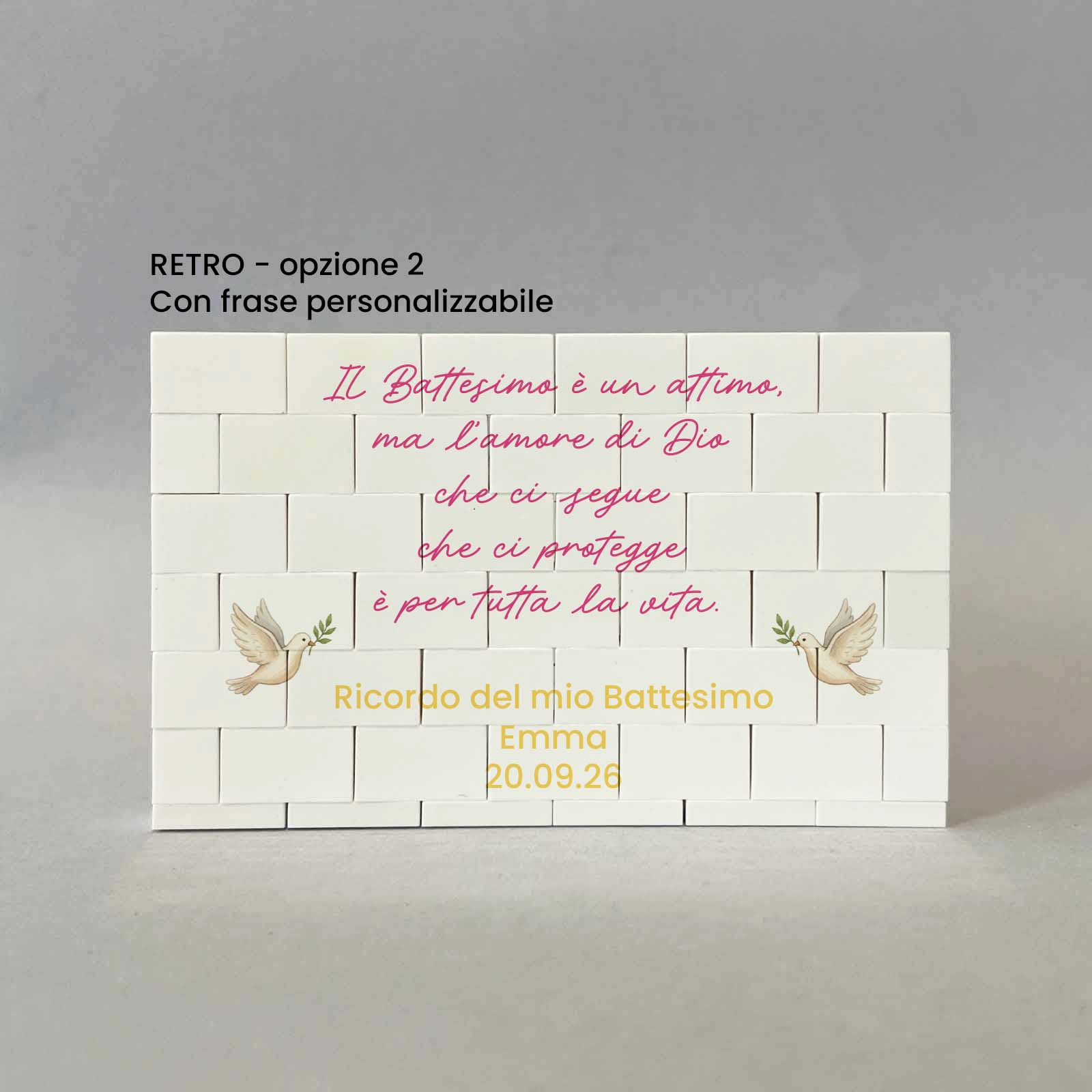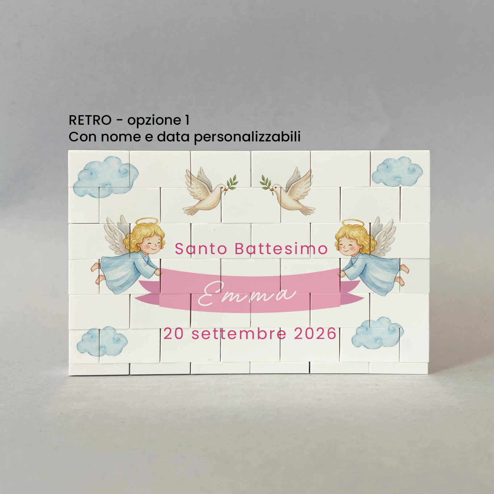 Lavorazione: stampa fronte con foto con sul lato sinistro il disegno di un angioletto. Stampa retro con frase e sui lati il disegno di due angioletti che sorreggono un nastro rosa, son presenti anche due colombe e delle nuvolette.