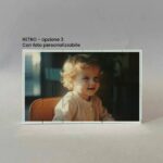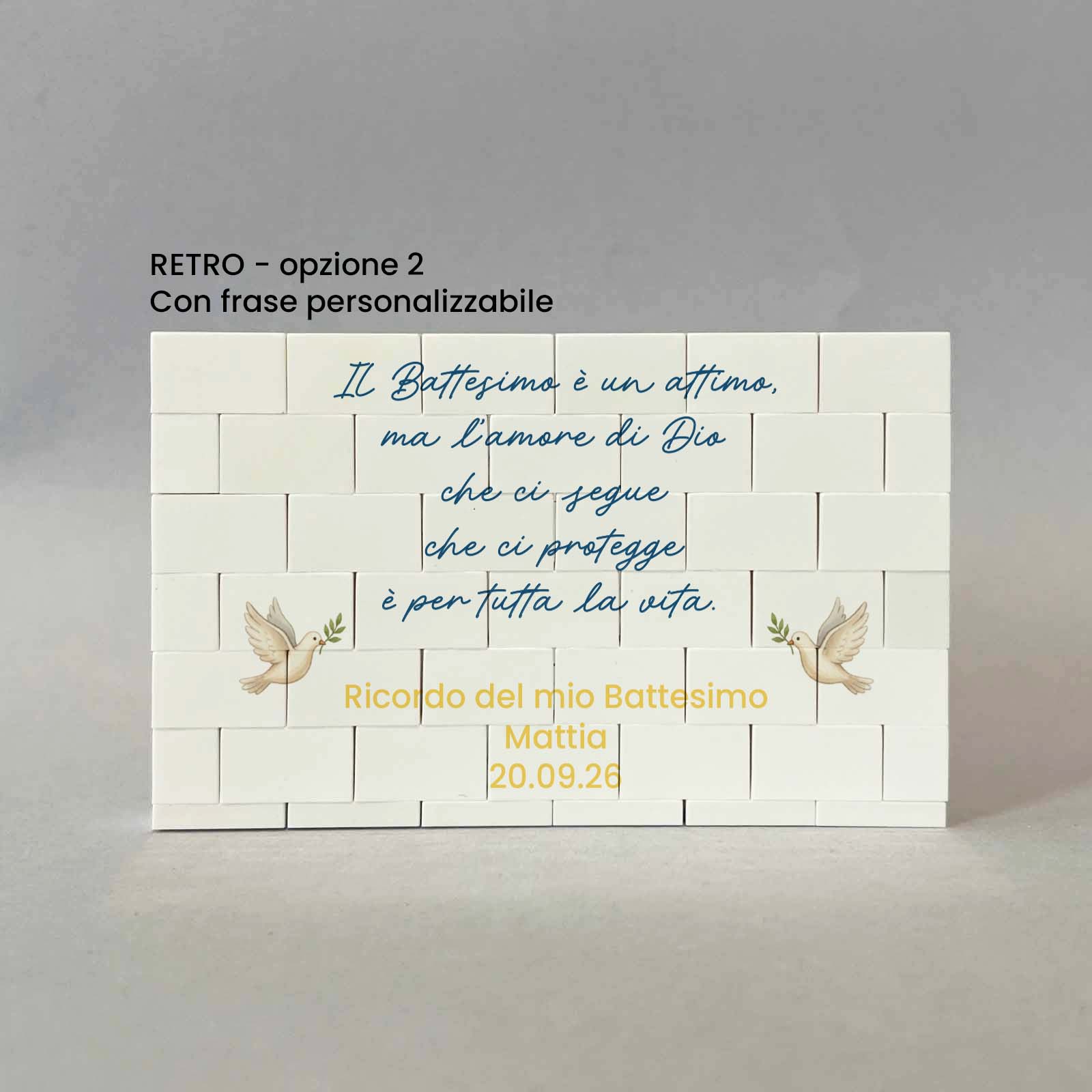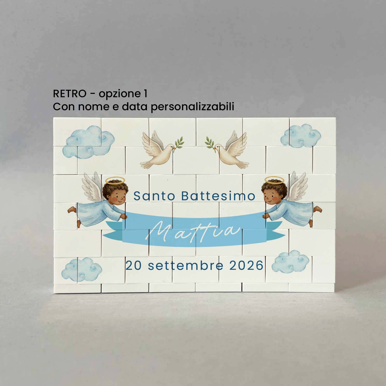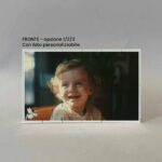 Lavorazione: stampa fronte con foto con sul lato sinistro il disegno di un angioletto. Stampa retro con frase e sui lati il disegno di due angioletti che sorreggono un nastro azzurro, son presenti anche due colombe e delle nuvolette.
