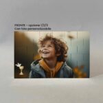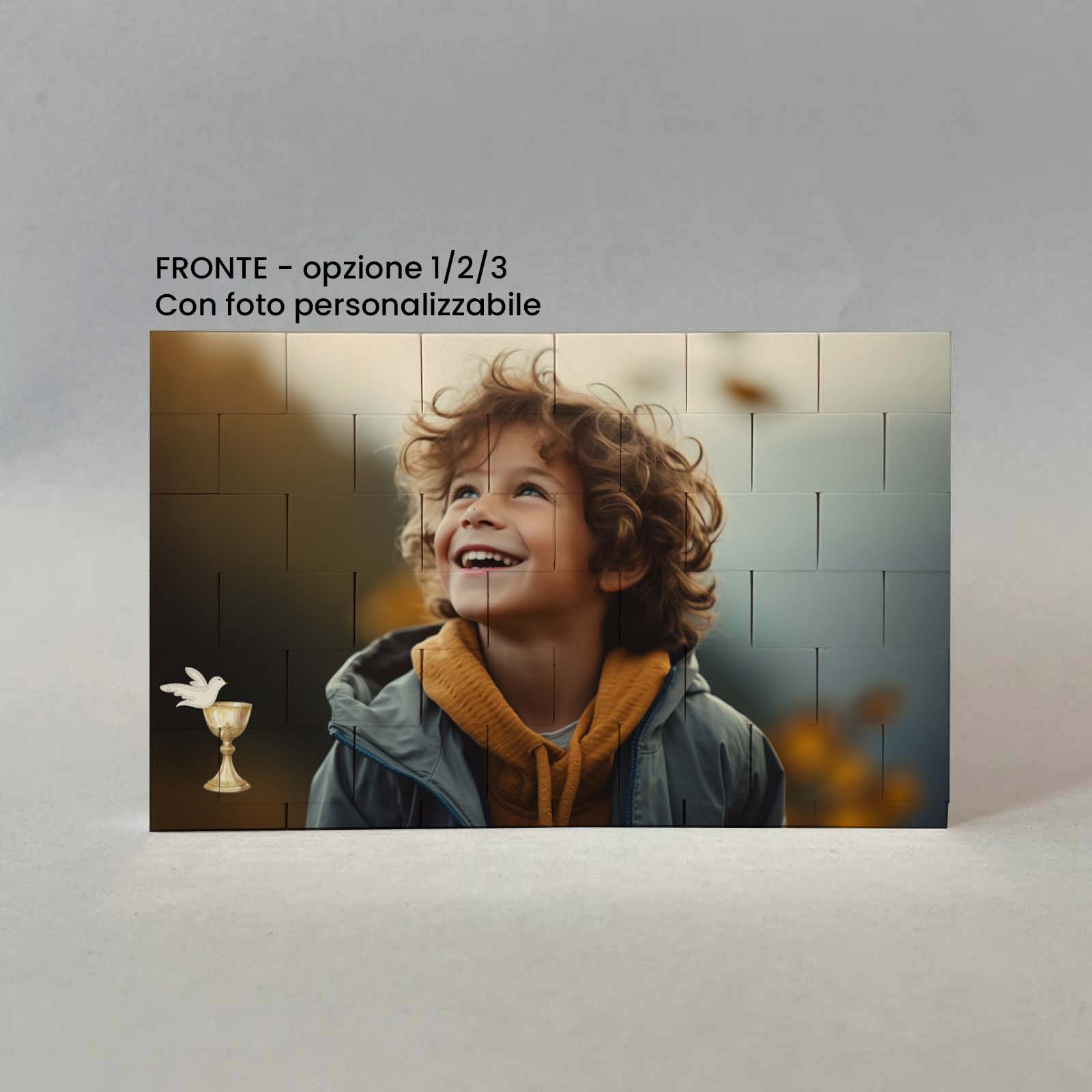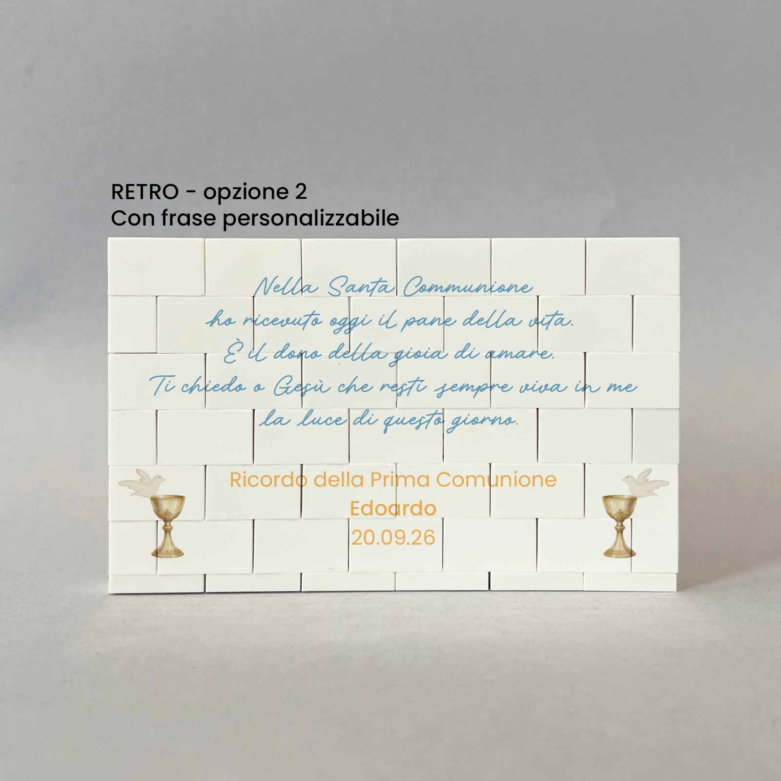 Lavorazione: stampa fronte con foto. Stampa retro con frase e sul lato sinistro il disegno di un calice dorato, sopra il quale si trova un’ostia bianca con una piccola croce. Attorno al calice ci sono dei fiori.
