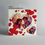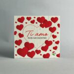 Lavorazione: stampa fronte due foto a forma di cuoricino e frase circondate da cuori. Stampa retro sfondo con cuoricini e frase all’interno di un cuore.