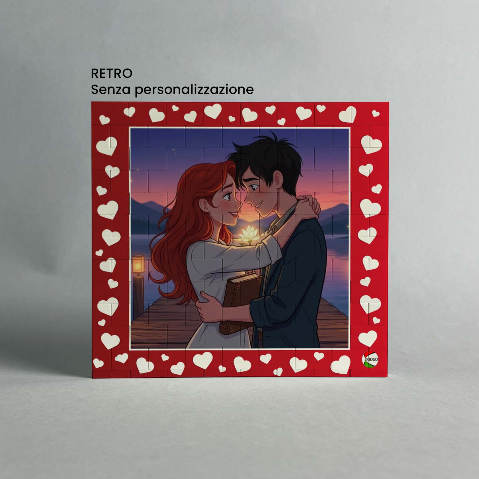 Lavorazione: stampa fronte foto e frase con sfondo rosso con cuoricini bianchi. Stampa retro foto con sfondo rosso con cuoricini bianchi.