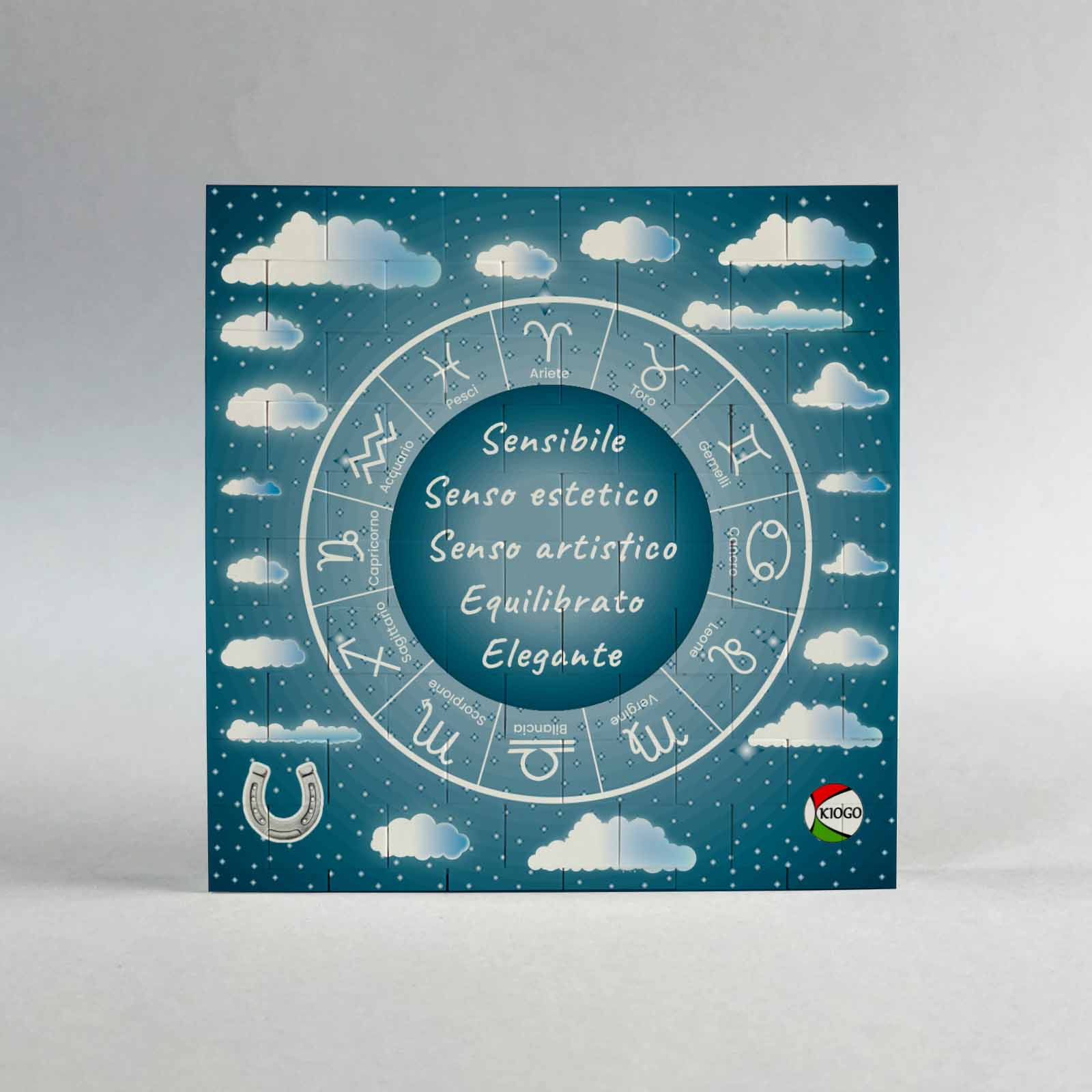 Lavorazione: Stampa fronte con segno zodiacale lucido al centro dello zodiaco e indicazione del segno, del periodo e dell’elemento. Stampa retro con caratteristiche al centro dello zodiaco e elemento.