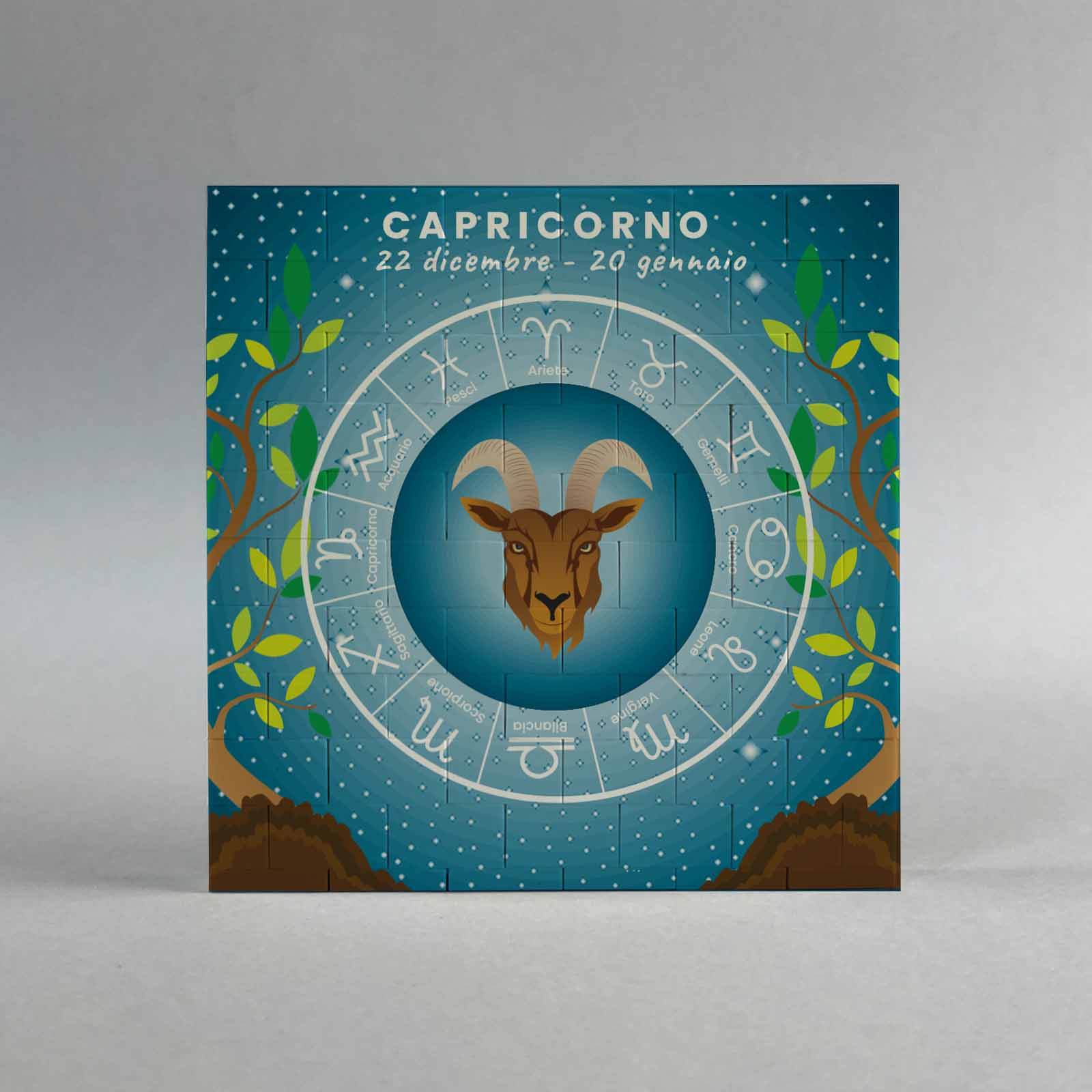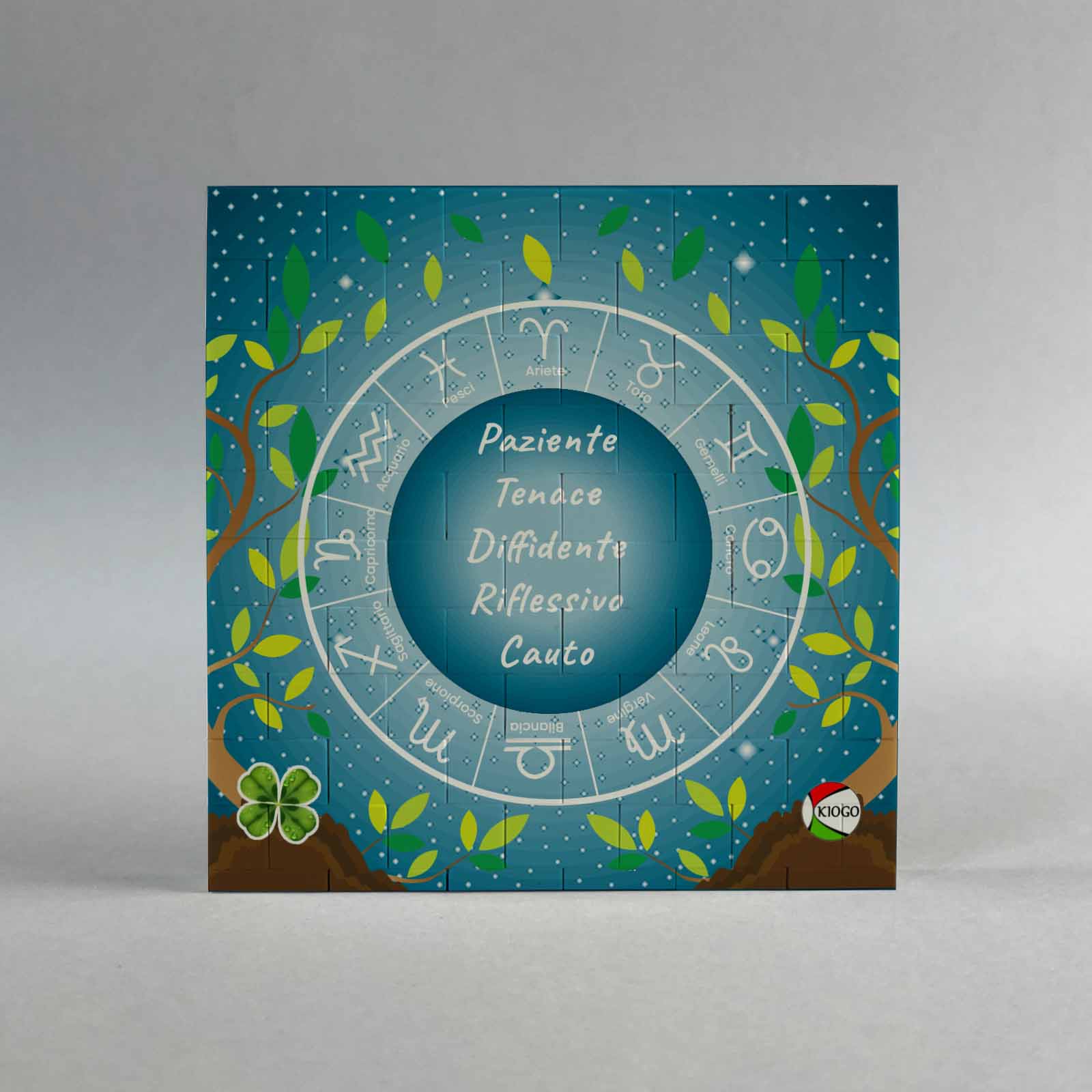 Lavorazione: Stampa fronte con segno zodiacale lucido al centro dello zodiaco e indicazione del segno, del periodo e dell’elemento. Stampa retro con caratteristiche al centro dello zodiaco e elemento.