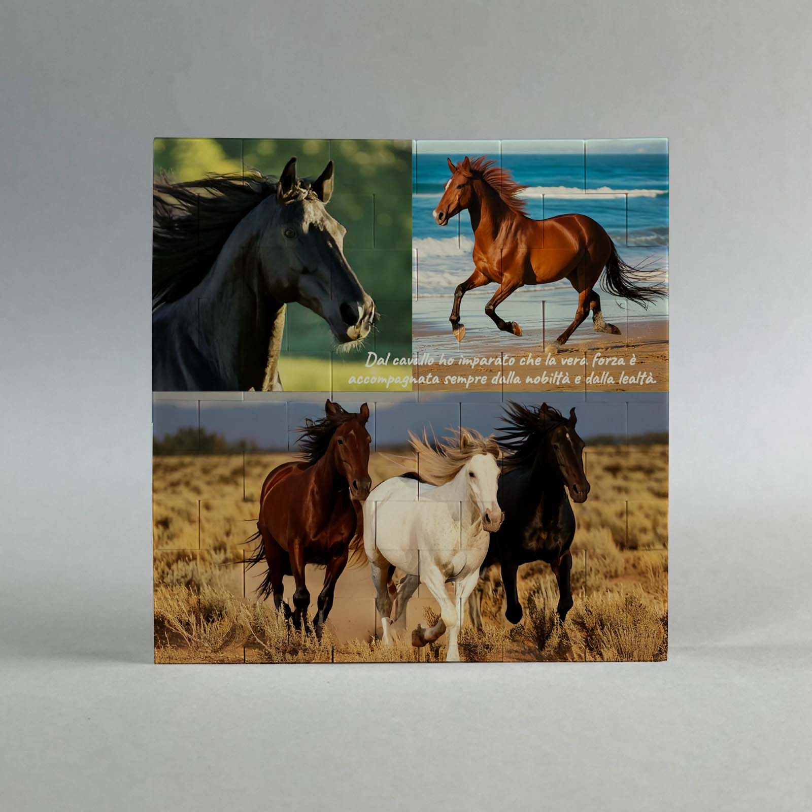 Lavorazione: stampa fronte-retro con foto di cavalli vari e aforisma dedicato