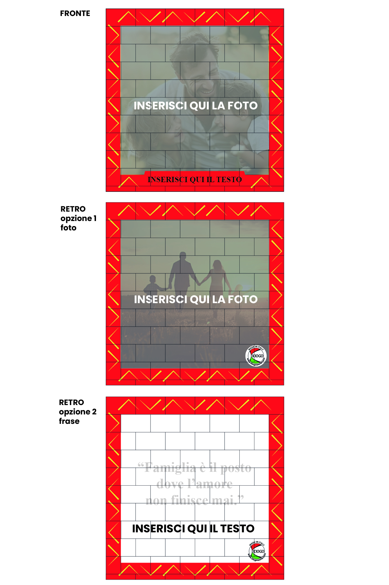 Personalizzazione: SI – Foto fronte con messaggio su 1 riga (max. 18 caratteri totali) più foto retro oppure messaggio senza foto su max. 6 righe e 100 caratteri