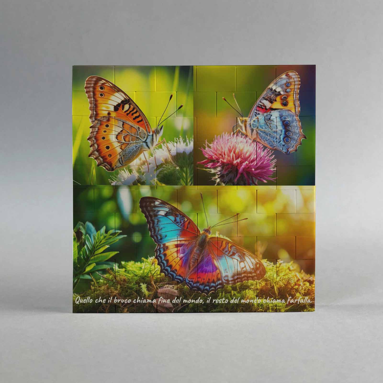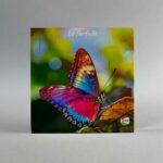Lavorazione: stampa fronte con foto di farfalla. Stampa retro con foto di farfalle e frase.