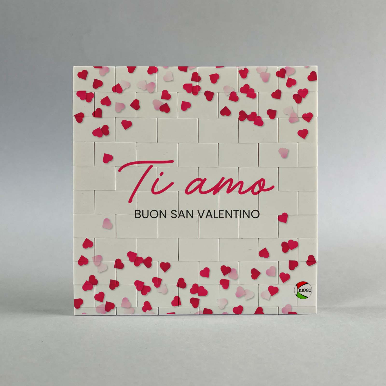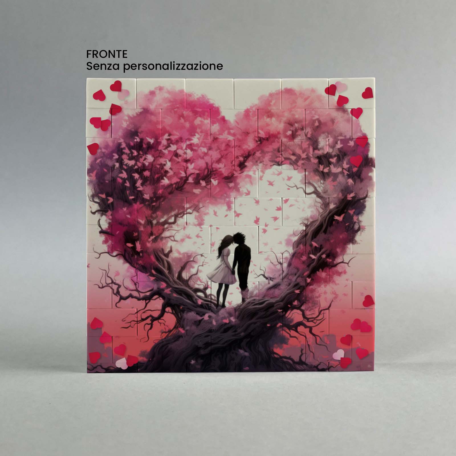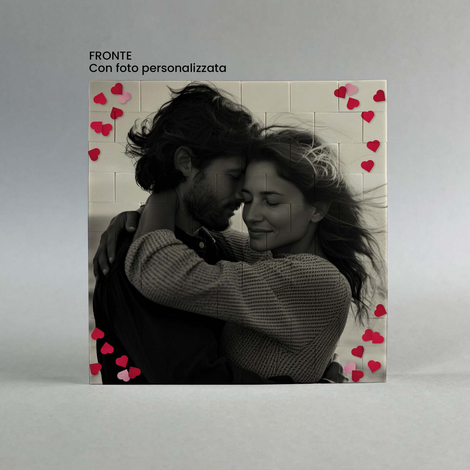 Lavorazione: stampa fronte foto circondati dai cuoricini. Stampa retro sfondo con cuoricini e frase.