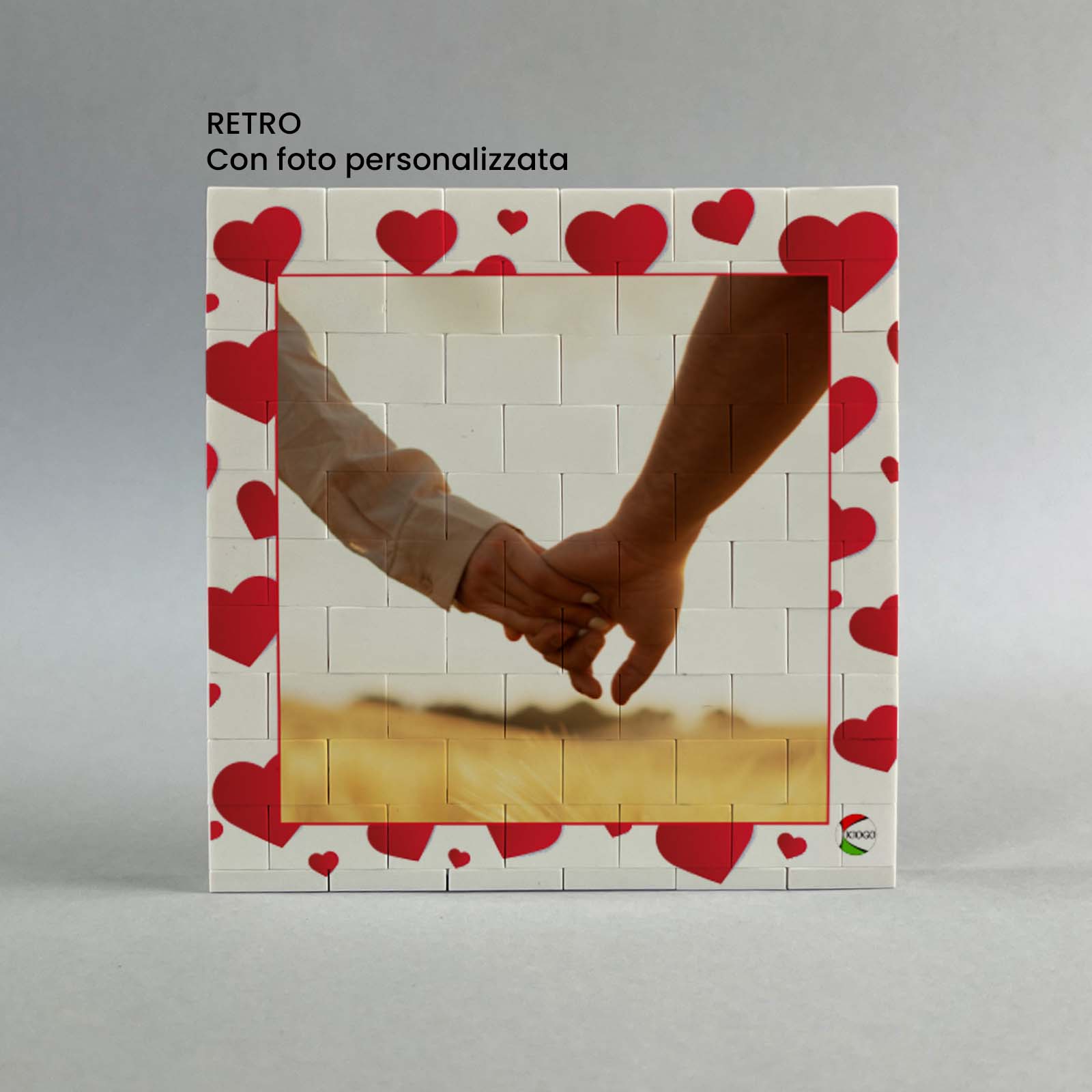 Lavorazione: stampa fronte foto e frase con sfondo bianco con cuoricini rossi. Stampa retro foto con sfondo bianco con cuoricini rossi.