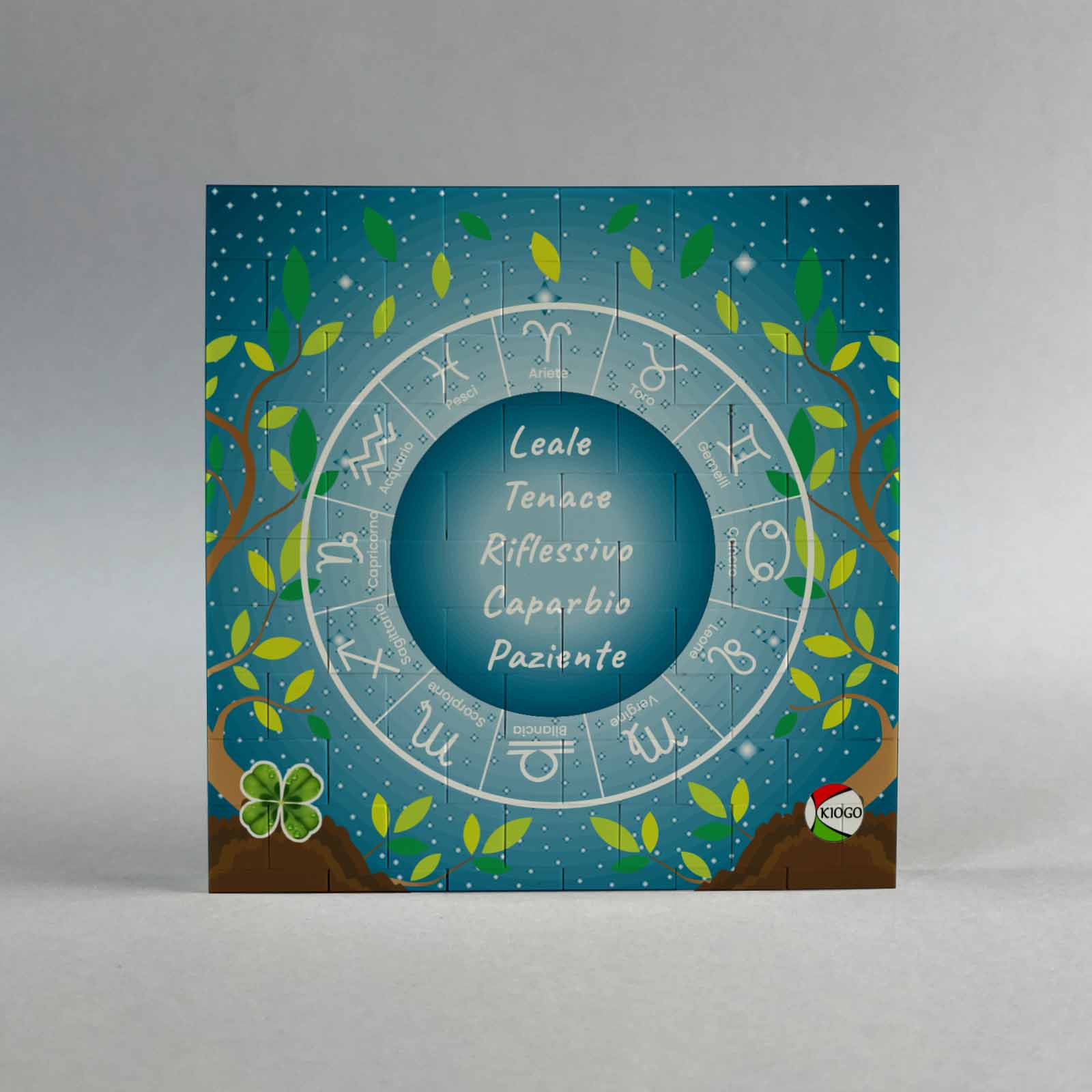 Lavorazione: Stampa fronte con segno zodiacale lucido al centro dello zodiaco e indicazione del segno, del periodo e dell’elemento. Stampa retro con caratteristiche al centro dello zodiaco e elemento.