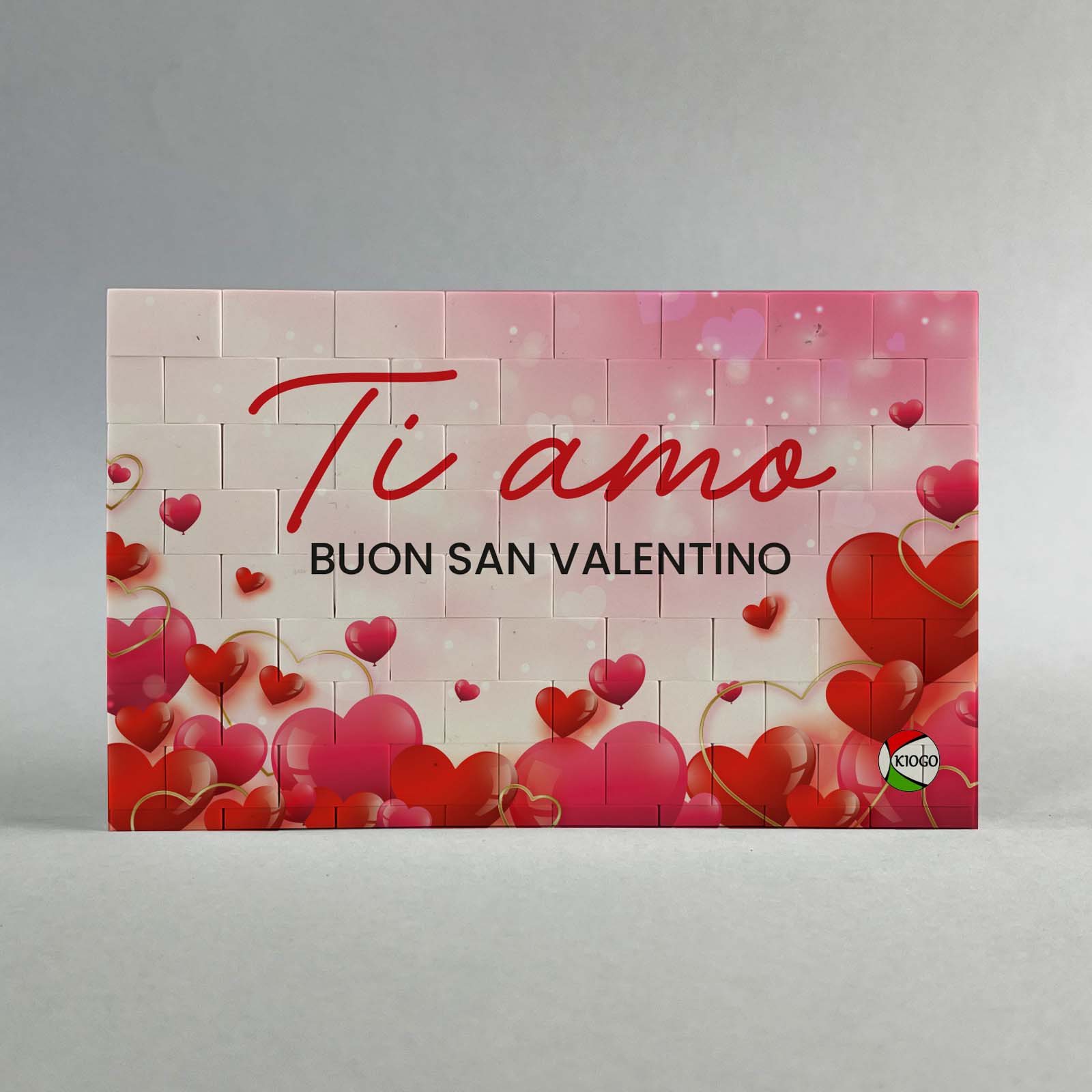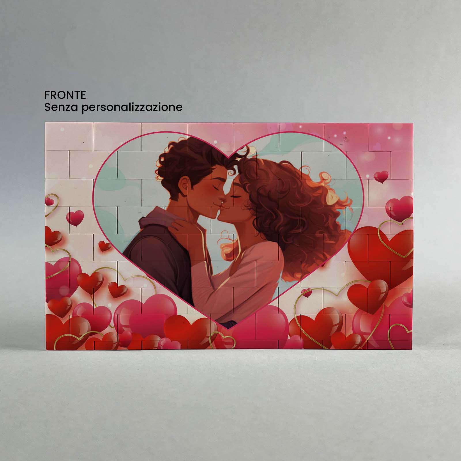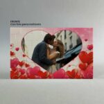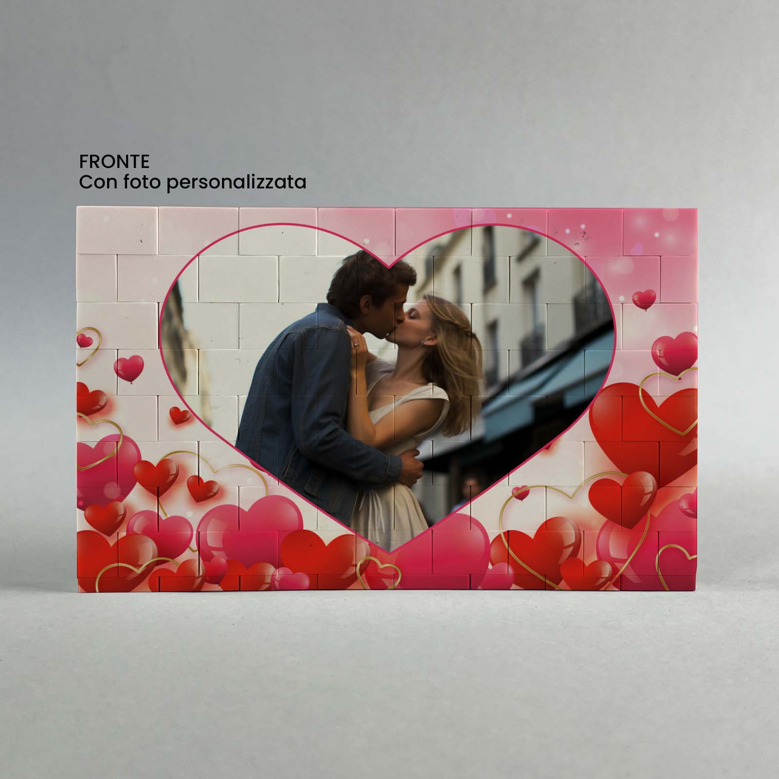 Lavorazione: stampa fronte foto a forma di cuoricino e circondata da cuori. Stampa retro sfondo con cuoricini e frase.