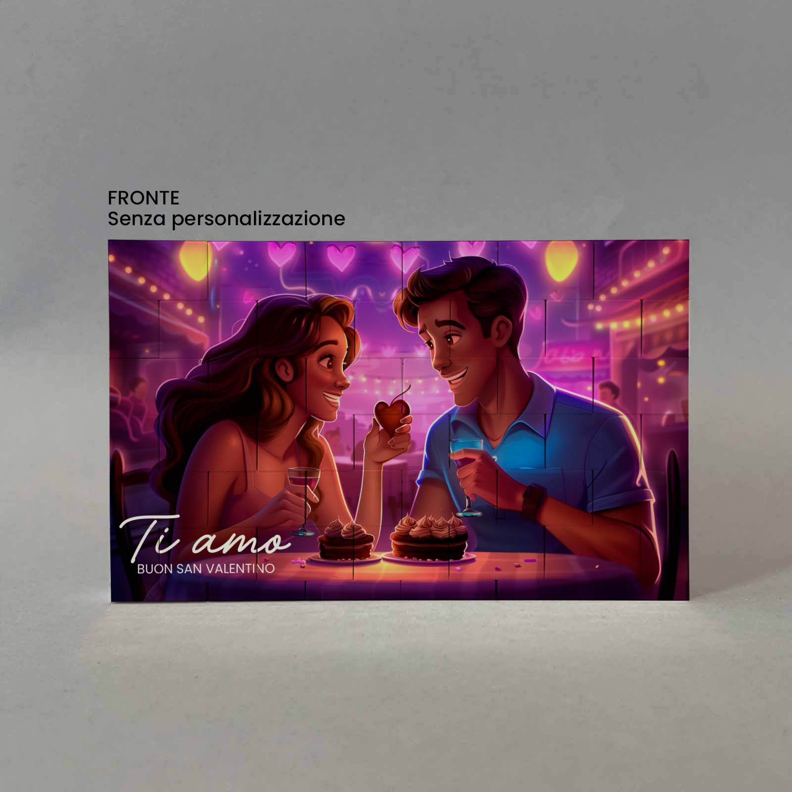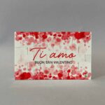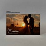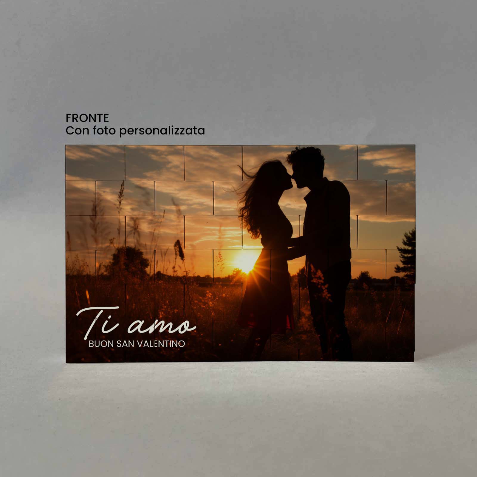 Lavorazione: stampa fronte con foto e frase. Stampa retro sfondo con cuoricini e frase.