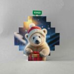 Lavorazione: stampa fronte-retro di un orso bianco con in mano un pacco regalo