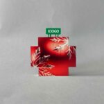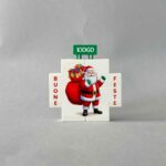 Lavorazione: stampa fronte di Babbo Natale che sorregge sulle spalle un sacco pieno di regali con scritta “Buone feste”. Stampa retro di una pallina rossa con fiocchi di neve.