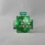 Lavorazione: stampa fronte di uno gnomo con in mano delle lucine e scritta “Buone feste”. Stampa retro di una pallina verde con fiocchi di neve.