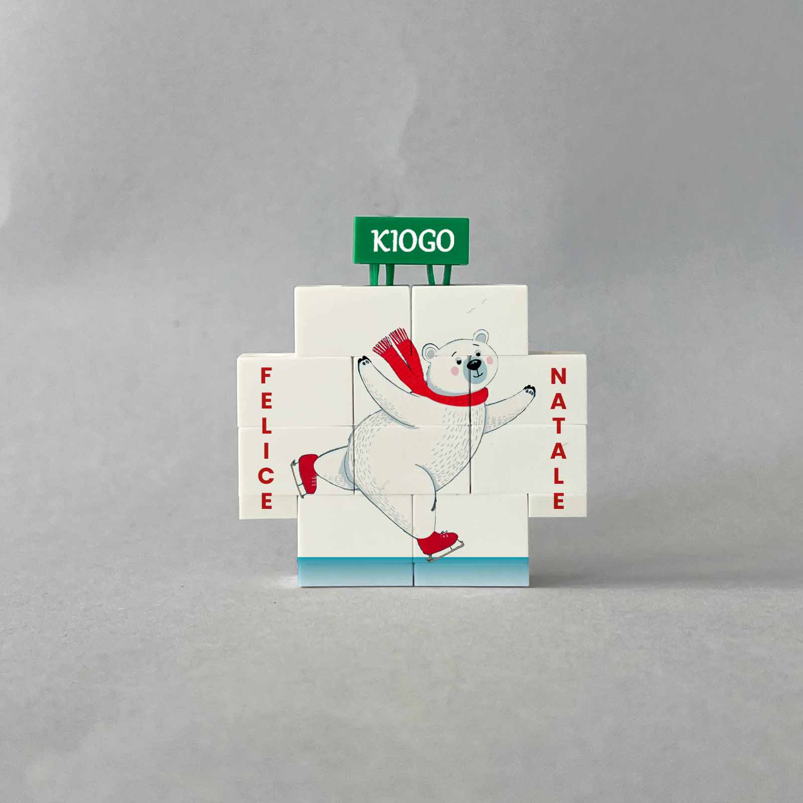 Lavorazione: stampa fronte di un orso bianco con sciarpa rossa che pattina su una pista di ghiaccio e scritta “Felice Natale”. Stampa retro di una pallina argento con decorazioni argento glitterate.